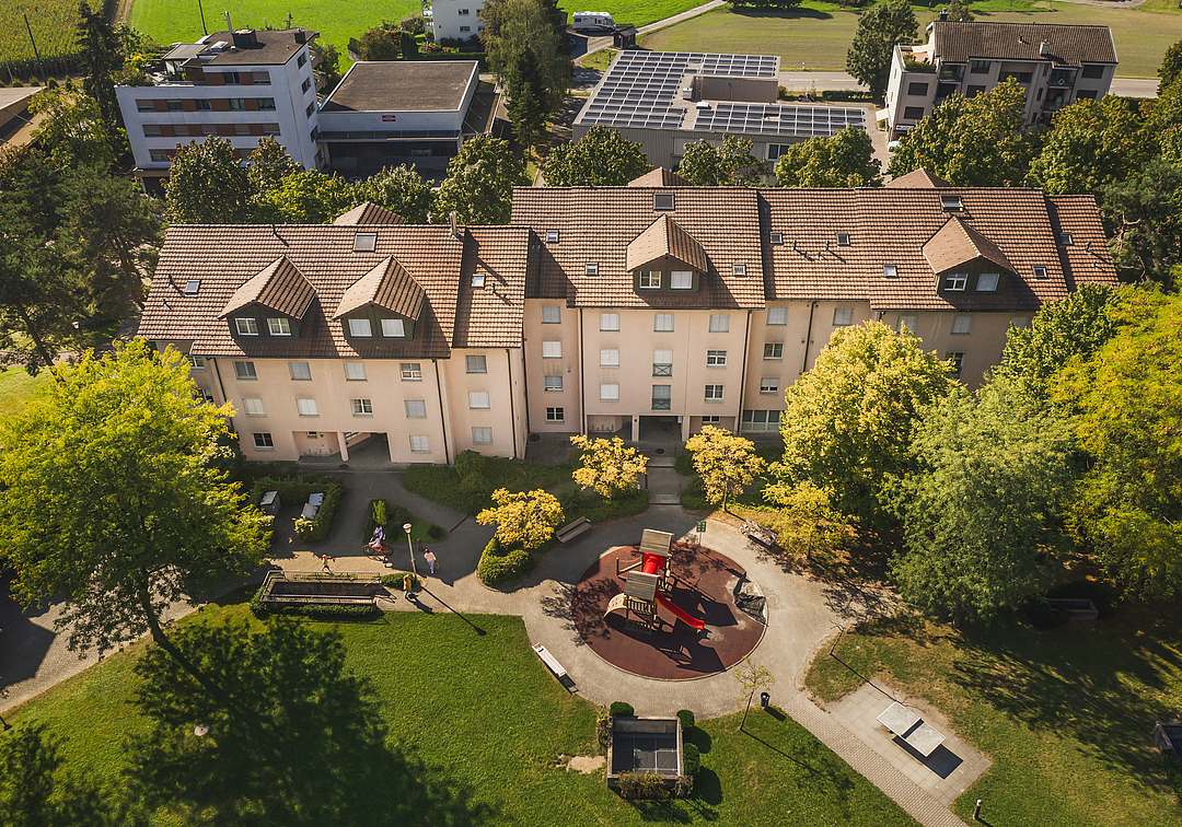 Die 1991 erstellte Häuserreihe ist Teil einer grossen, kinderfreundlichen Überbauung im etwas abgelegeneren nördlichen Teil von Cham, im Gebiet Langacker. Die Wohnungen wurden 2021/22 umfassend saniert.