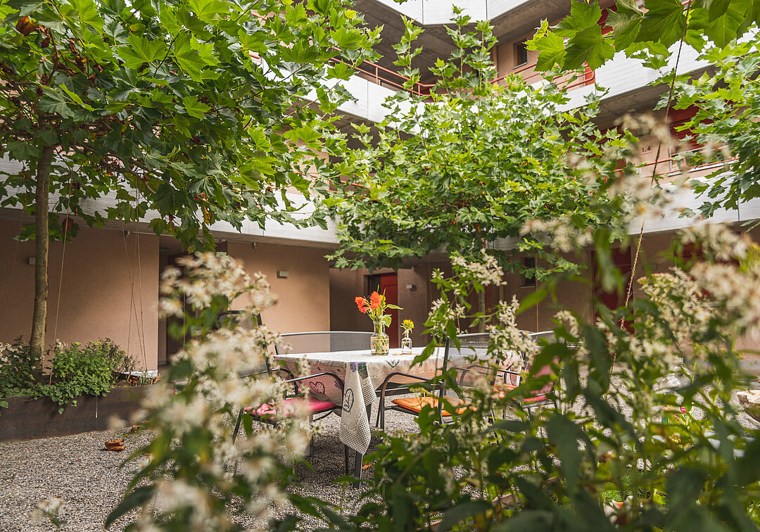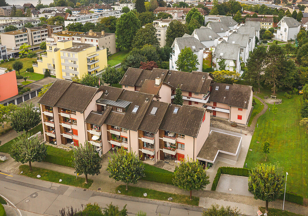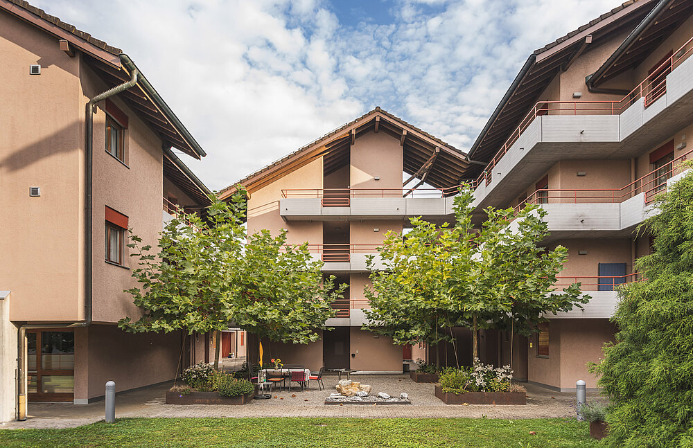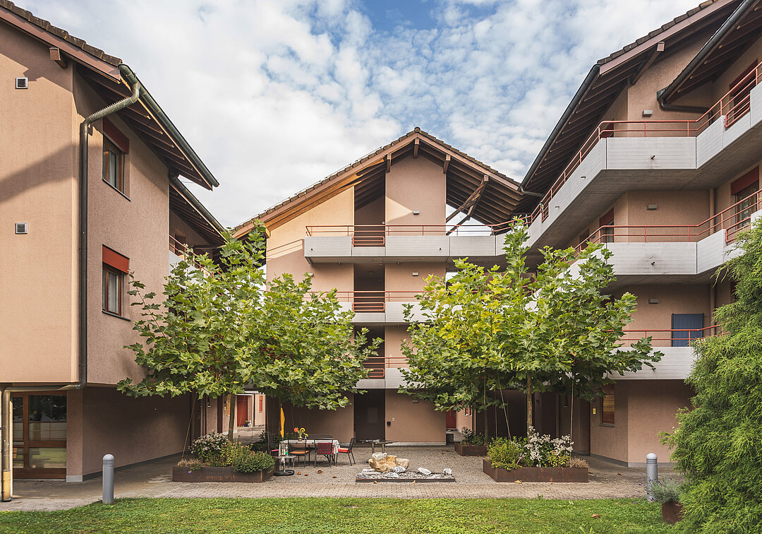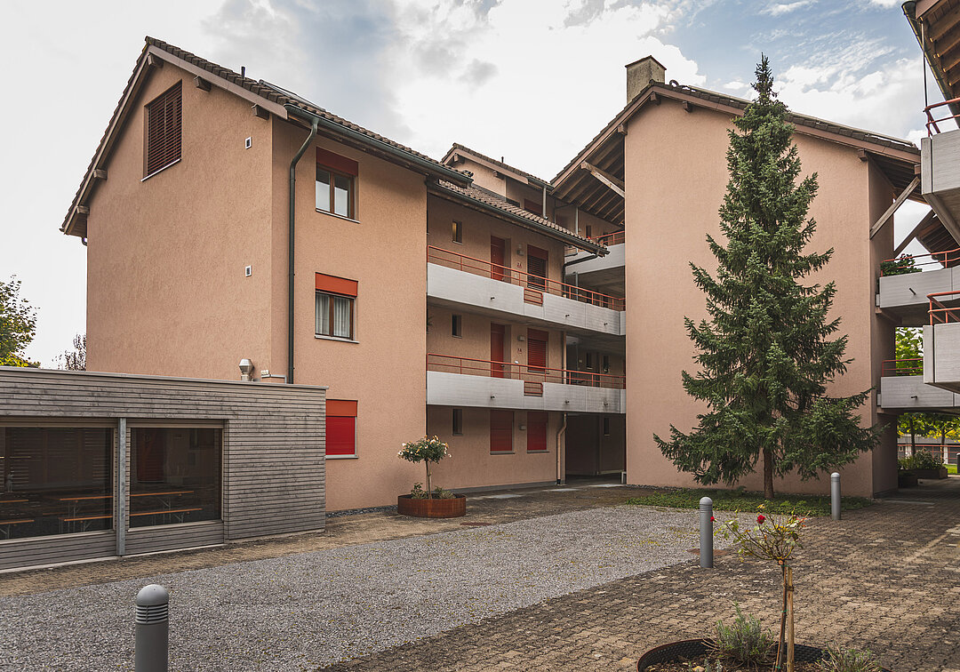 Die Wohnungen sind einfach, jedoch zweckmässig eingerichtet. Die Kleinwohnungen verfügen über eine begehbare Dusche/WC. Die zwei 4-Zimmer-Wohnungen haben zusätzlich eine Badewanne. Aussenanlagen mit Bänkli und einer Pergola laden zum Verweilen ein.